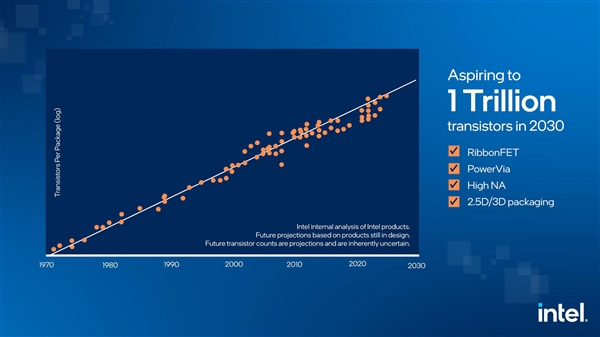 集成电上能够容纳的晶体管数量每过18-24个月就会翻一番,处置器机能随之翻倍,而价钱下降可一半。虽然多年来良多人都说“摩尔定律已死”,可是部门半导体企业、工程师、评论人士认为,摩尔定律仍然健正在且形态优良。现在的一颗芯片可能包含几十甚至上百亿个晶体管。而按照Intel的线年,单颗芯片包含的晶体管数量将冲破1万亿个。